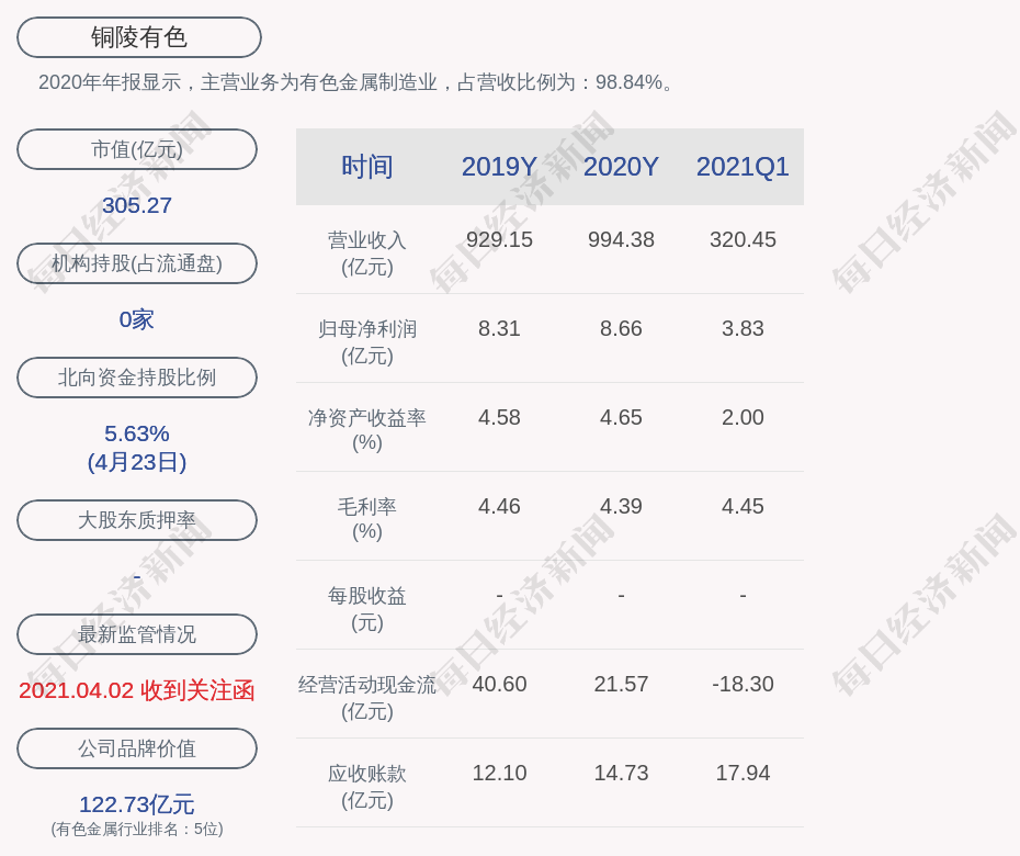 2020年年報顯示,銅陵有色的主營業(yè)務(wù)為有色金屬制造業(yè),占營收比例為:98.84%。