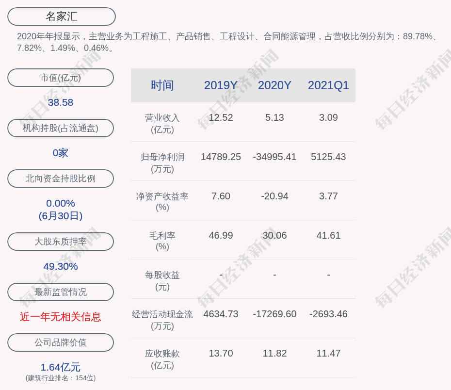 2020年年報顯示,名家匯的主營業(yè)務為工程施工、產(chǎn)品銷售、工程設計、合同能源管理,占營收比例分別為:89.78%、7.82%、1.49%、0.46%。