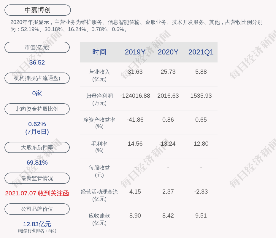 2020年年報(bào)顯示,中嘉博創(chuàng)的主營業(yè)務(wù)為維護(hù)服務(wù)、信息智能傳輸、金服業(yè)務(wù)、技術(shù)開發(fā)服務(wù)、其他,占營收比例分別為:52.19%、30.18%、16.24%、0.78%、0.6%。