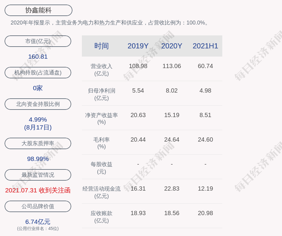 每經(jīng)AI快訊,協(xié)鑫能科(SZ 002015,收盤價(jià):11.89元)8月18日晚間發(fā)布半年度業(yè)績(jī)報(bào)告稱,2021年上半年?duì)I業(yè)收入約60.74億元,同比增加14.09%;歸屬于上市公司股東的凈利潤(rùn)盈利約4.98億元,同比增加42.14%;基本每股收益盈利0.3685元,同比增加42.11%。分配方案為:不分紅、不送紅股、不轉(zhuǎn)增。