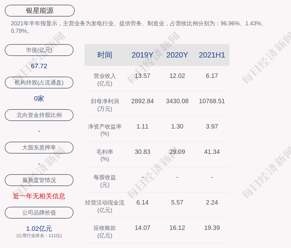 2021年半年報(bào)顯示,銀星能源的主營業(yè)務(wù)為發(fā)電行業(yè)、提供勞務(wù)、制造業(yè),占營收比例分別為:96.96%、1.43%、0.79%。