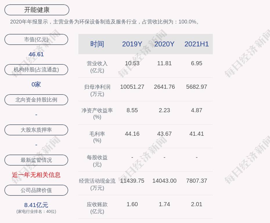 2020年年報(bào)顯示,開(kāi)能健康的主營(yíng)業(yè)務(wù)為環(huán)保設(shè)備制造及服務(wù)行業(yè),占營(yíng)收比例為:100.0%。
