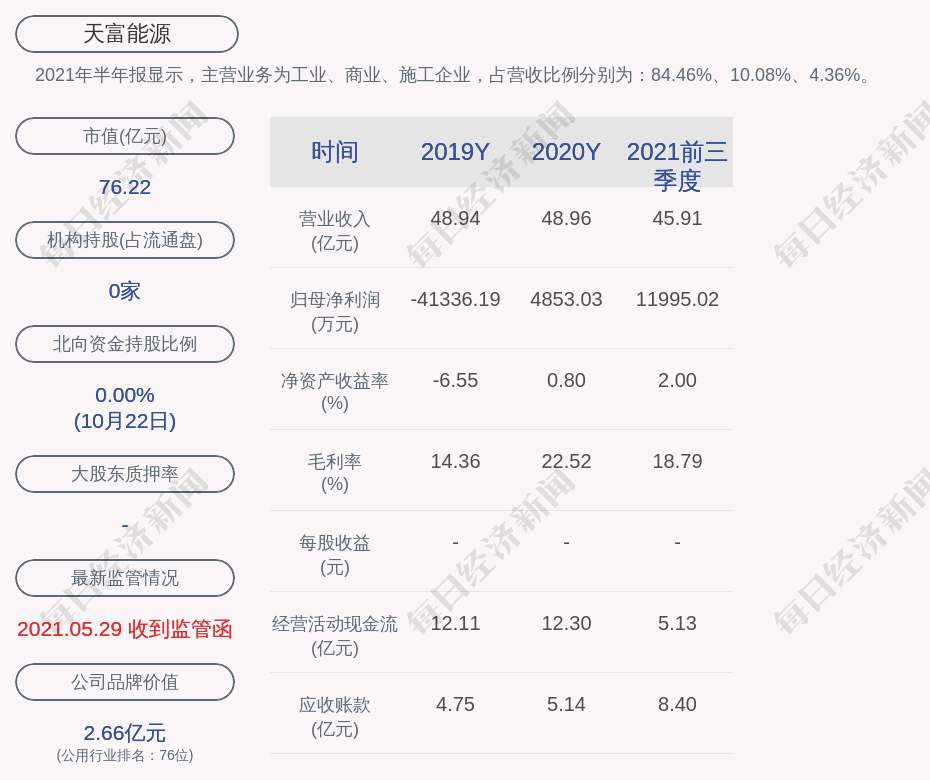 2021年半年報(bào)顯示,天富能源的主營(yíng)業(yè)務(wù)為工業(yè)、商業(yè)、施工企業(yè),占營(yíng)收比例分別為:84.46%、10.08%、4.36%。