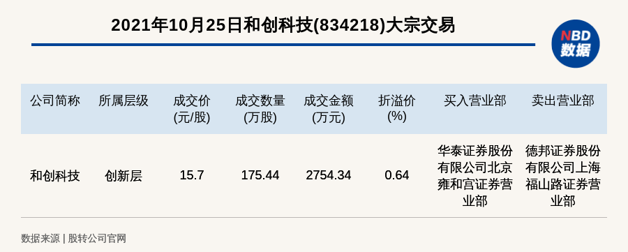 每經(jīng)AI快訊,2021年10月25日,新三板創(chuàng)新層公司和創(chuàng)科技(834218)發(fā)生一筆大宗交易,成交價(jià)15.7元/股,成交數(shù)量175.44萬(wàn)股,成交金額2754.34萬(wàn)元,溢價(jià)0.64%。買入營(yíng)業(yè)部是華泰證券股份有限公司北京雍和宮證券營(yíng)業(yè)部,賣出營(yíng)業(yè)部是德邦證券股份有限公司上海福山路證券營(yíng)業(yè)部。