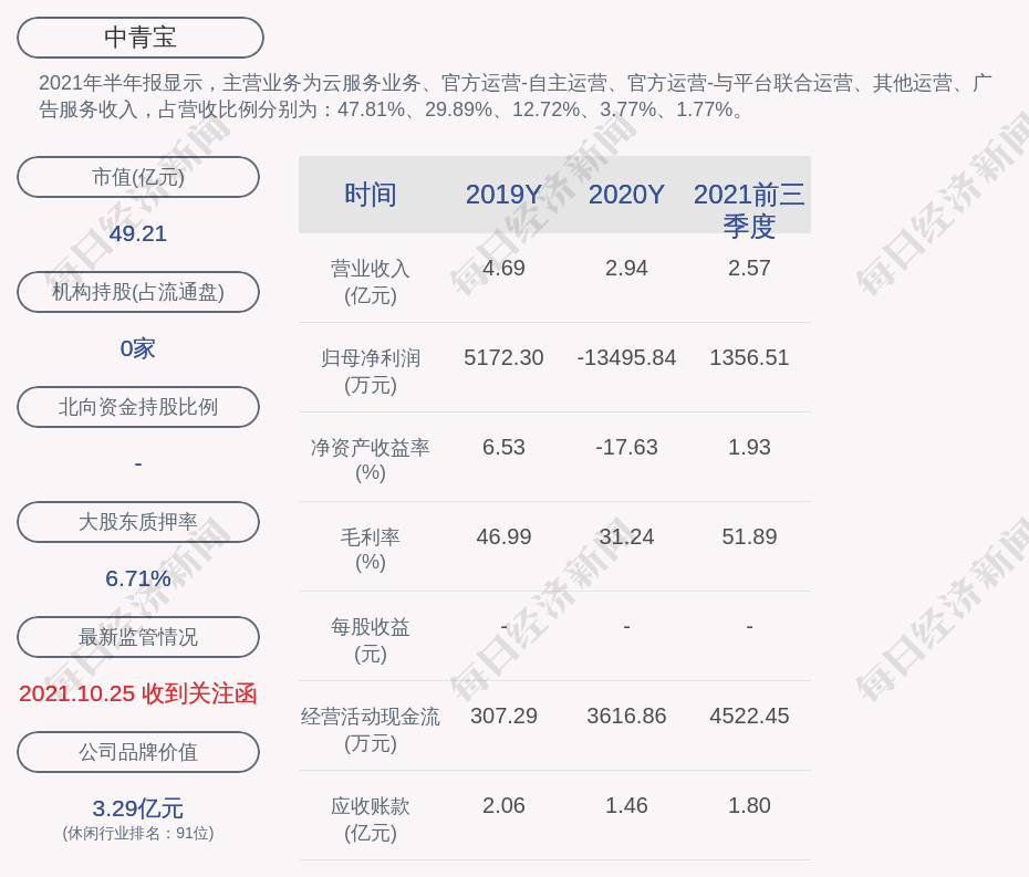 2021年半年報顯示,中青寶的主營業(yè)務為云服務業(yè)務、官方運營-自主運營、官方運營-與平臺聯(lián)合運營、其他運營、廣告服務收入,占營收比例分別為:47.81%、29.89%、12.72%、3.77%、1.77%。