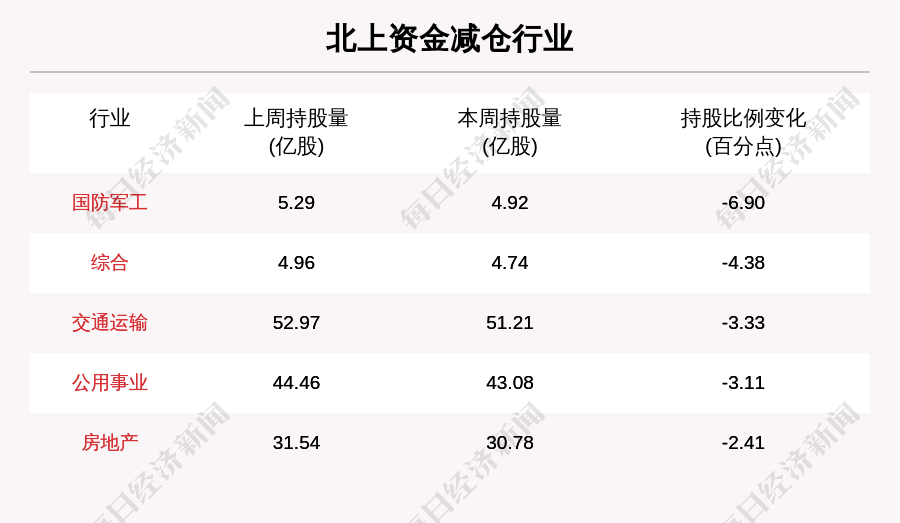 本周北上資金減倉的行業(yè)共有14個。其中,國防軍工行業(yè)減倉最明顯,北上資金持股數(shù)環(huán)比減少6.90%。其他北上資金減倉較多的行業(yè)還包括綜合、交通運輸、公用事業(yè)。