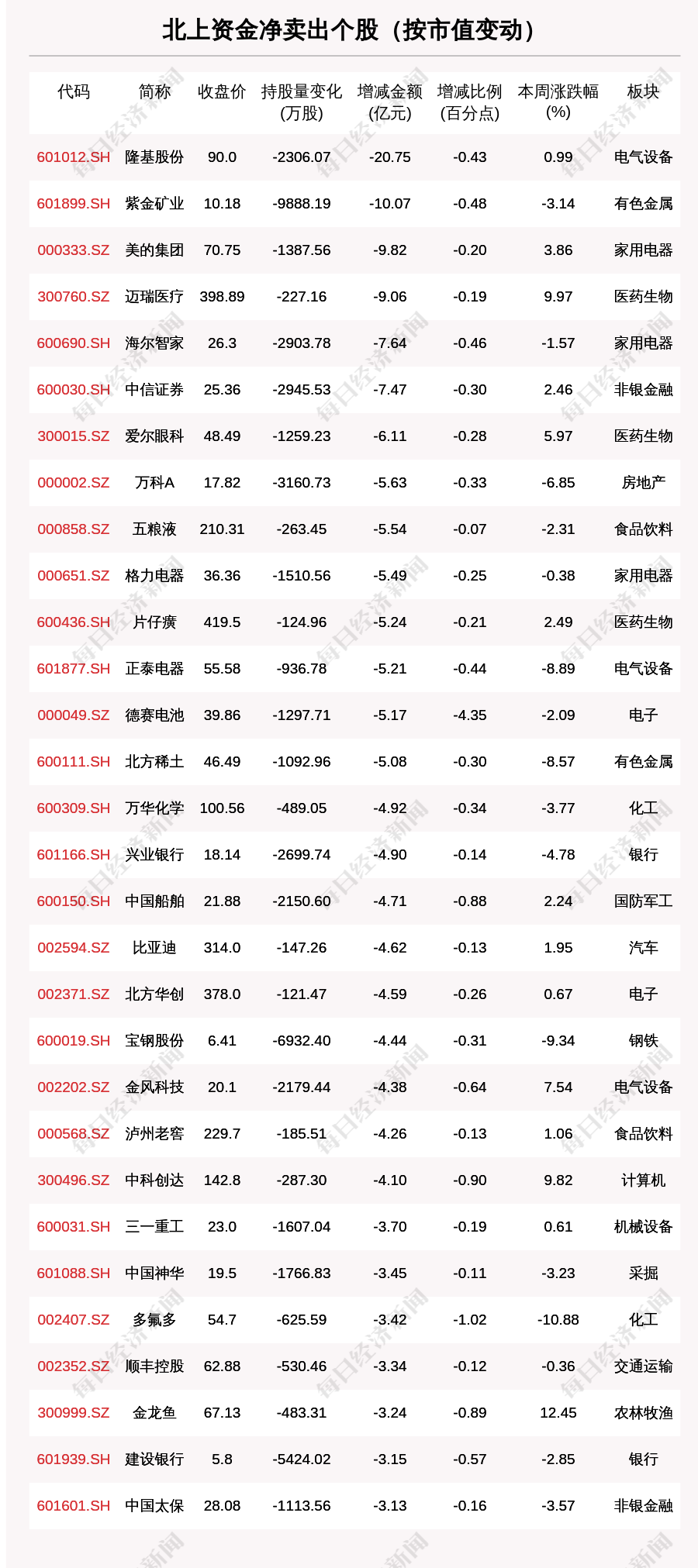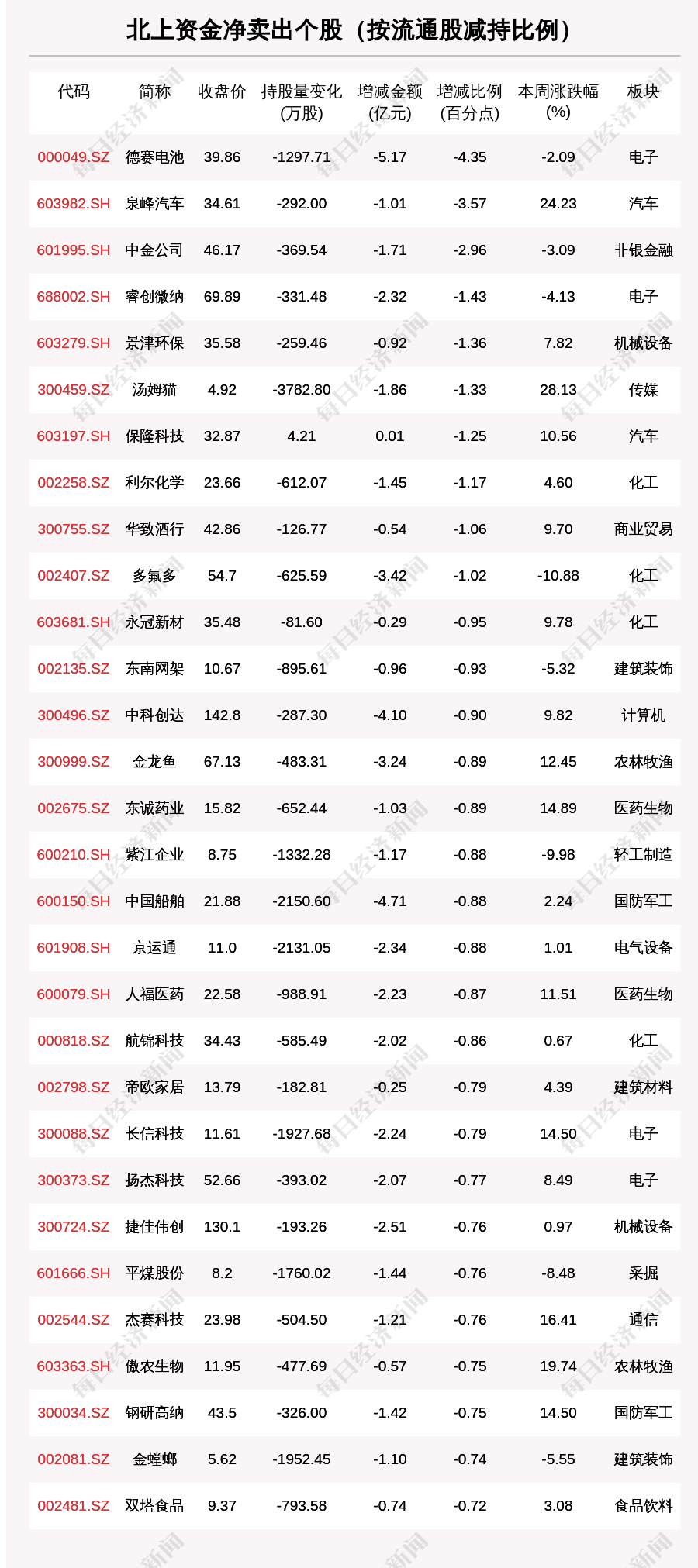 本周北上資金凈賣出個股共有668只,北上資金減倉比例超1%的有603只。其中,德賽電池(000049.SZ,收盤價:39.86元)減倉比例最為明顯,最新持股比例2.24%,環(huán)比減少7.92個百分點。其他北上資金減倉比例較多的個股還包括泉峰汽車(603982.SH,收盤價:34.61元)、中金公司(601995.SH,收盤價:46.17元)、睿創(chuàng)微納(688002.SH,收盤價:69.89元)。