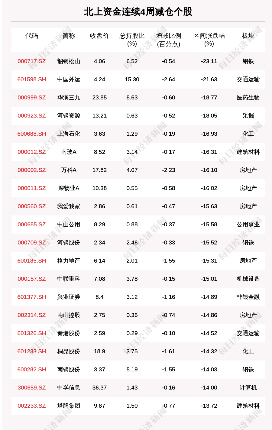 北上資金連續(xù)4周賣出109個股,其中醫(yī)藥生物行業(yè)的個股最多,有17只。從市場表現(xiàn)來看,北上資金連續(xù)4周的減倉個股中,本周80只個股股價下跌,其中韶鋼松山(000717.SZ,收盤價:4.06元)跌幅最大,下跌23.11%,其他跌幅較大的個股包括中國外運(601598.SH,收盤價:4.24元)、華潤三九(000999.SZ,收盤價:23.85元)、河鋼資源(000923.SZ,收盤價:13.21元)。