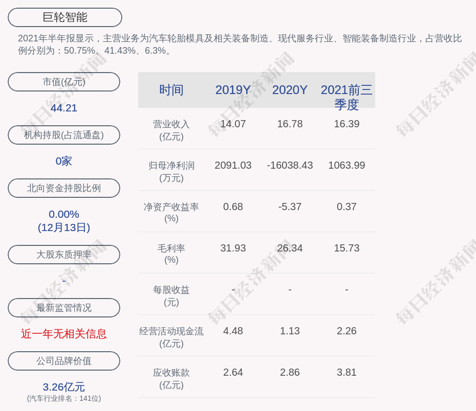 2021年半年報顯示,巨輪智能的主營業(yè)務(wù)為汽車輪胎模具及相關(guān)裝備制造、現(xiàn)代服務(wù)行業(yè)、智能裝備制造行業(yè),占營收比例分別為:50.75%、41.43%、6.3%。