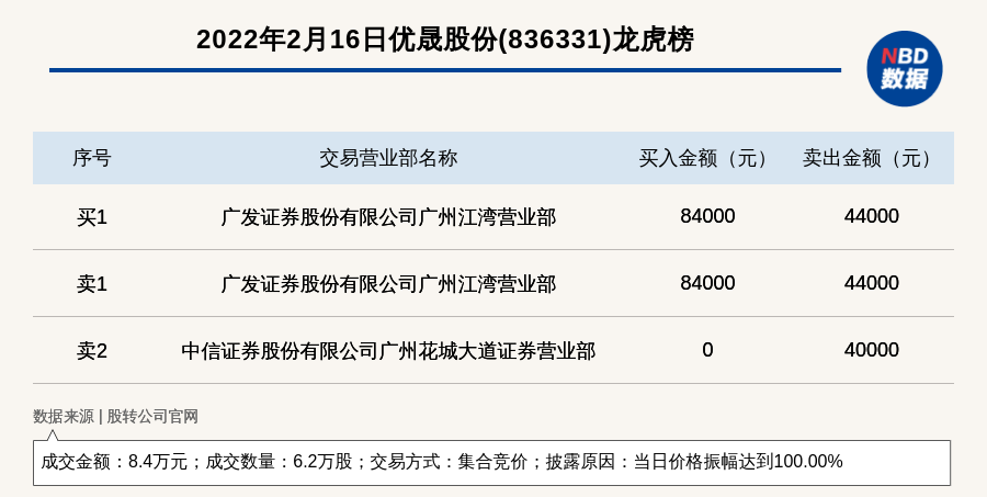 每經(jīng)訊,2022年2月16日,新三板基礎(chǔ)層公司優(yōu)晟股份(836331)登上龍虎榜,交易方式是集合競價,披露原因是當(dāng)日價格振幅達(dá)到100.00%,成交數(shù)量6.2萬股,成交金額8.4萬元。買一席位為廣發(fā)證券股份有限公司廣州江灣營業(yè)部,買入8.4萬元;賣一席位為廣發(fā)證券股份有限公司廣州江灣營業(yè)部,賣出4.4萬元。