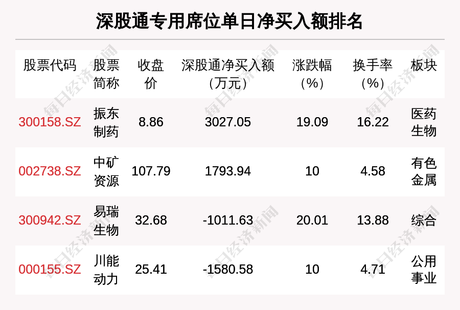 在龍虎榜中,涉及深股通專用席位的個(gè)股有4只,振東制藥的深股通專用席位凈買入額最大,凈買入3027.05萬元。