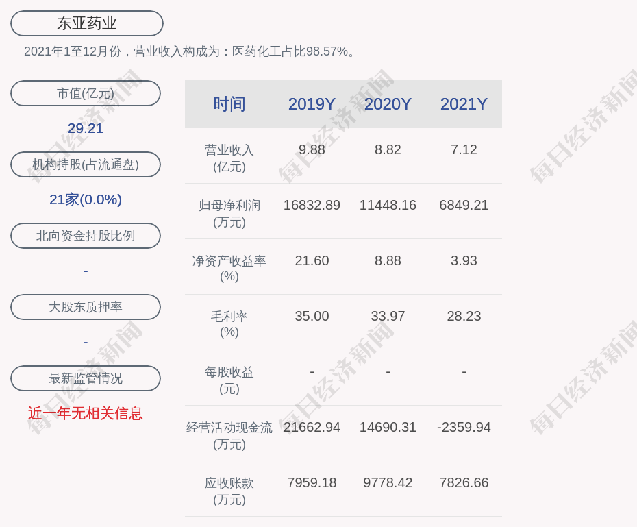 2021年1至12月份,東亞藥業(yè)的營業(yè)收入構(gòu)成為:醫(yī)藥化工占比98.57%。
