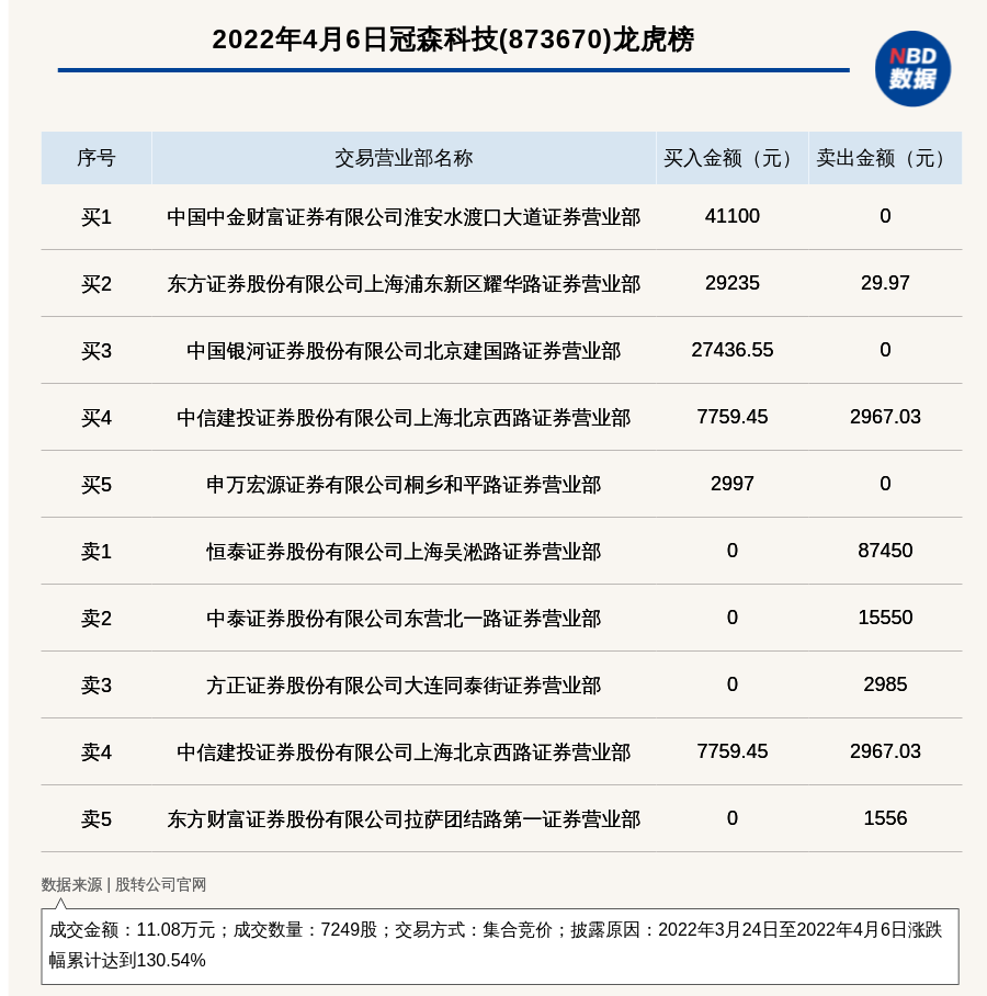 每經(jīng)訊,2022年4月6日,新三板創(chuàng)新層公司冠森科技(873670)登上龍虎榜,交易方式是集合競(jìng)價(jià),披露原因是2022年3月24日至2022年4月6日漲跌幅累計(jì)達(dá)到130.54%,成交數(shù)量7249股,成交金額11.08萬元。買一席位為中國中金財(cái)富證券有限公司淮安水渡口大道證券營業(yè)部,買入4.11萬元;賣一席位為恒泰證券股份有限公司上海吳淞路證券營業(yè)部,賣出8.74萬元。