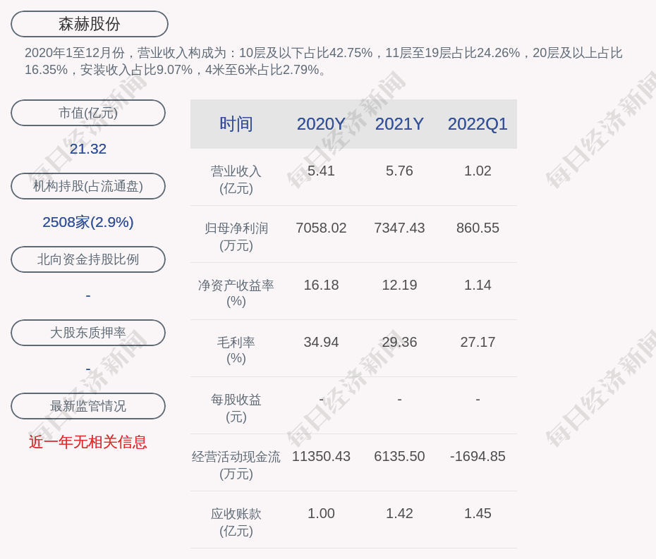 2020年1至12月份,森赫股份的營業(yè)收入構(gòu)成為:10層及以下占比42.75%,11層至19層占比24.26%,20層及以上占比16.35%,安裝收入占比9.07%,4米至6米占比2.79%。