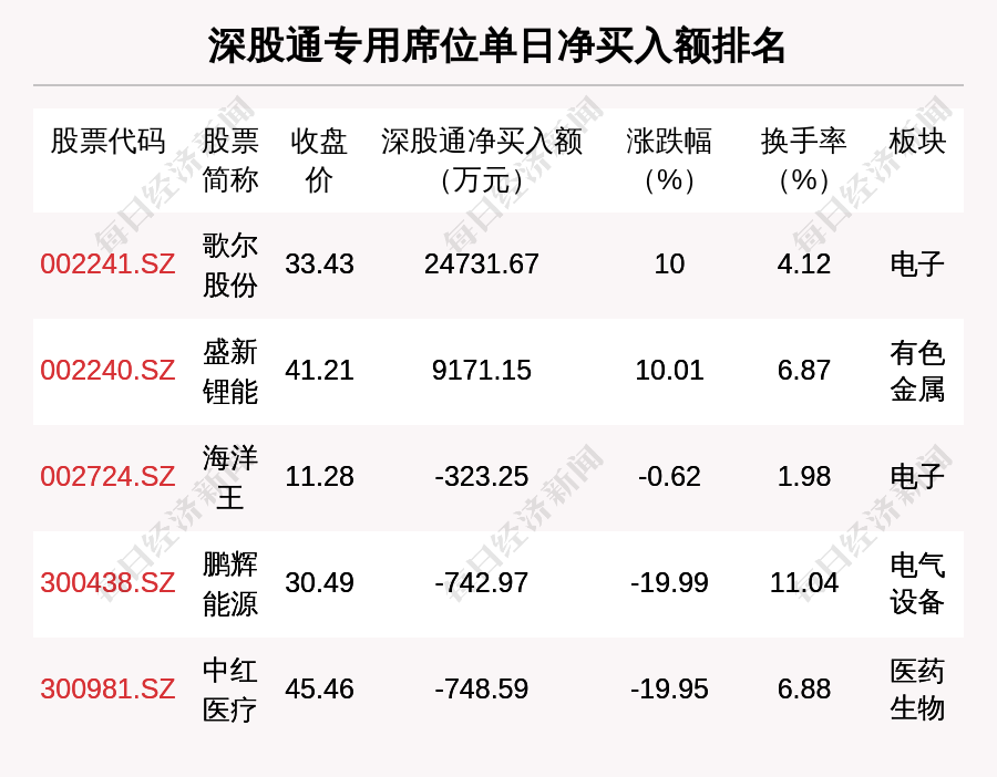 在龍虎榜中,涉及深股通專用席位的個(gè)股有5只,歌爾股份的深股通專用席位凈買入額最大,凈買入2.47億元。