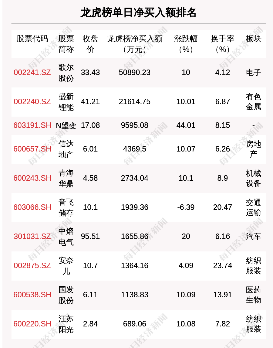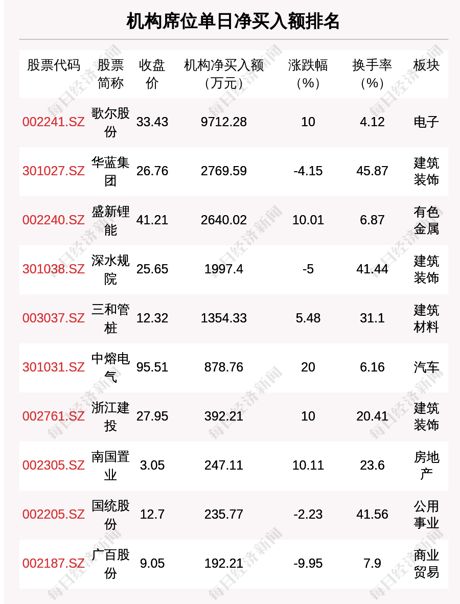 在龍虎榜中,涉及機(jī)構(gòu)專用席位的個(gè)股有25只,凈買入額前三的是歌爾股份、華藍(lán)集團(tuán)、盛新鋰能,分別為9712.28萬(wàn)元、2769.59萬(wàn)元、2640.02萬(wàn)元。