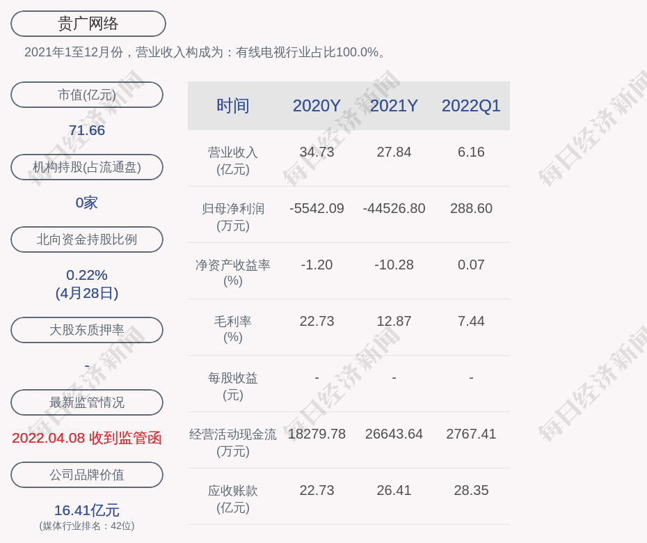 每經AI快訊,貴廣網絡(SH 600996,收盤價:6.73元)4月29日晚間發(fā)布年度業(yè)績報告稱,2021年營業(yè)收入約27.84億元,同比減少19.84%;歸屬于上市公司股東的凈利潤虧損約4.45億元;基本每股收益虧損0.42元。公司不進行利潤分配、公積金轉增股本。2020年同期營業(yè)收入約34.73億元;歸屬于上市公司股東的凈利潤虧損約5542萬元;基本每股收益虧損0.05元。
