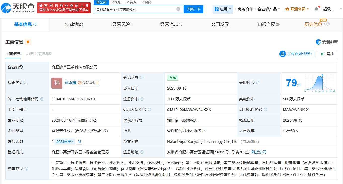 每經(jīng)AI快訊,天眼查天眼風(fēng)險(xiǎn)信息顯示,近日,合肥歐普三羊科技有限公司新增一條簡(jiǎn)易注銷公告,公告期為11月20日至12月9日。該公司成立于2023年8月,法定代表人為孫永建,注冊(cè)資本3000萬(wàn)元人民幣,經(jīng)營(yíng)范圍包括第一類醫(yī)療器械銷售、第二類醫(yī)療器械銷售、日用品銷售、化妝品零售等。股東信息顯示,該公司由歐普康視(300595)、合肥三只羊網(wǎng)絡(luò)科技有限公司、趙春生共同持股。