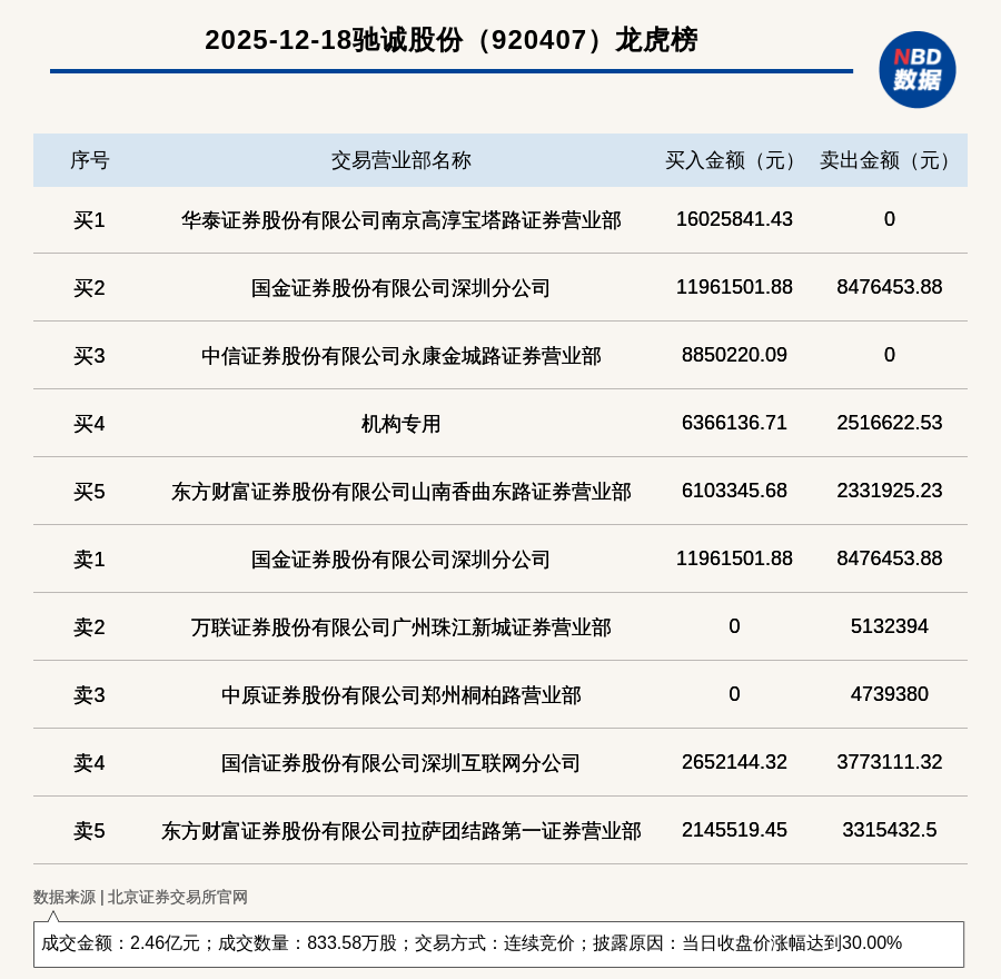 每經(jīng)訊,2025年12月18日,北交所上市公司馳誠(chéng)股份(920407,收盤價(jià):34.71元)登上龍虎榜,交易方式是連續(xù)競(jìng)價(jià),披露原因是當(dāng)日收盤價(jià)漲幅達(dá)到30.00%,成交數(shù)量833.58萬(wàn)股,成交金額2.46億元。買一席位為華泰證券股份有限公司南京高淳寶塔路證券營(yíng)業(yè)部,買入1602.58萬(wàn)元;賣一席位為國(guó)金證券股份有限公司深圳分公司,賣出847.65萬(wàn)元。