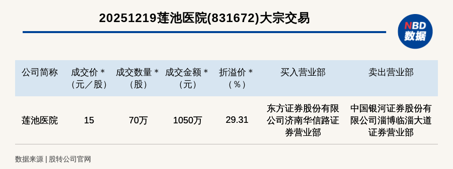 每經(jīng)訊,2025年12月19日,新三板創(chuàng)新層公司蓮池醫(yī)院(831672,收盤價:11.6元)發(fā)生一筆大宗交易,成交價15元/股,成交數(shù)量70萬股,成交金額1050萬元,溢價29.31%。買入營業(yè)部是東方證券股份有限公司濟(jì)南華信路證券營業(yè)部,賣出營業(yè)部是中國銀河證券股份有限公司淄博臨淄大道證券營業(yè)部。