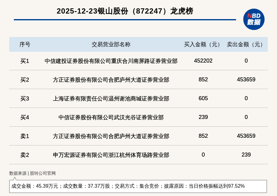 每經(jīng)訊,2025年12月23日,新三板創(chuàng)新層公司銀山股份(872247,收盤價(jià):1.23元)登上龍虎榜,交易方式是集合競(jìng)價(jià),披露原因是當(dāng)日價(jià)格振幅達(dá)到97.52%,成交數(shù)量37.37萬股,成交金額45.39萬元。買一席位為中信建投證券股份有限公司重慶合川南屏路證券營(yíng)業(yè)部,買入45.22萬元;賣一席位為方正證券股份有限公司合肥廬州大道證券營(yíng)業(yè)部,賣出45.37萬元。