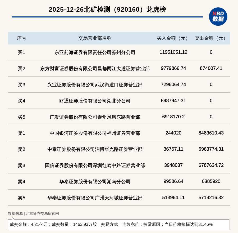 每經(jīng)訊,2025年12月26日,北交所上市公司北礦檢測(cè)(920160,收盤價(jià):28.97元)登上龍虎榜,交易方式是連續(xù)競(jìng)價(jià),披露原因是當(dāng)日價(jià)格振幅達(dá)到31.46%,成交數(shù)量1463.93萬股,成交金額4.21億元。買一席位為東亞前海證券有限責(zé)任公司蘇州分公司,買入1195.11萬元;賣一席位為中國(guó)銀河證券股份有限公司福州證券營(yíng)業(yè)部,賣出848.36萬元。