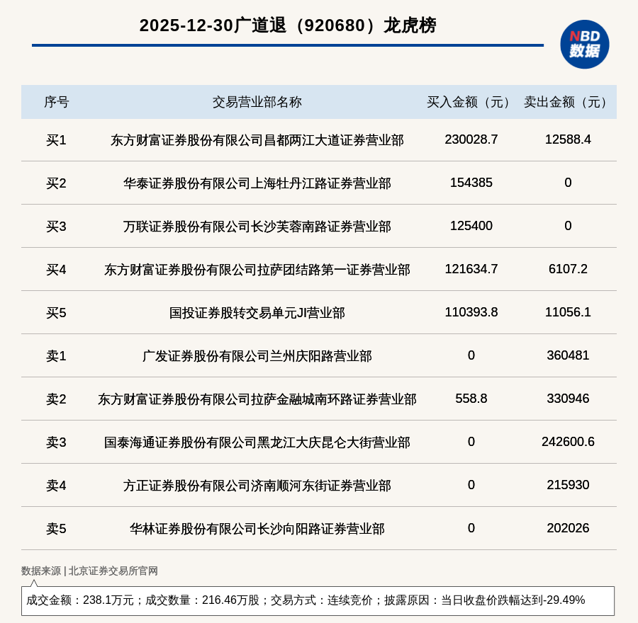 每經(jīng)訊,2025年12月30日,北交所上市公司廣道退(920680,收盤(pán)價(jià):1.1元)登上龍虎榜,交易方式是連續(xù)競(jìng)價(jià),披露原因是當(dāng)日收盤(pán)價(jià)跌幅達(dá)到-29.49%,成交數(shù)量216.46萬(wàn)股,成交金額238.1萬(wàn)元。買(mǎi)一席位為東方財(cái)富證券股份有限公司昌都兩江大道證券營(yíng)業(yè)部,買(mǎi)入23萬(wàn)元;賣(mài)一席位為廣發(fā)證券股份有限公司蘭州慶陽(yáng)路營(yíng)業(yè)部,賣(mài)出36.05萬(wàn)元。