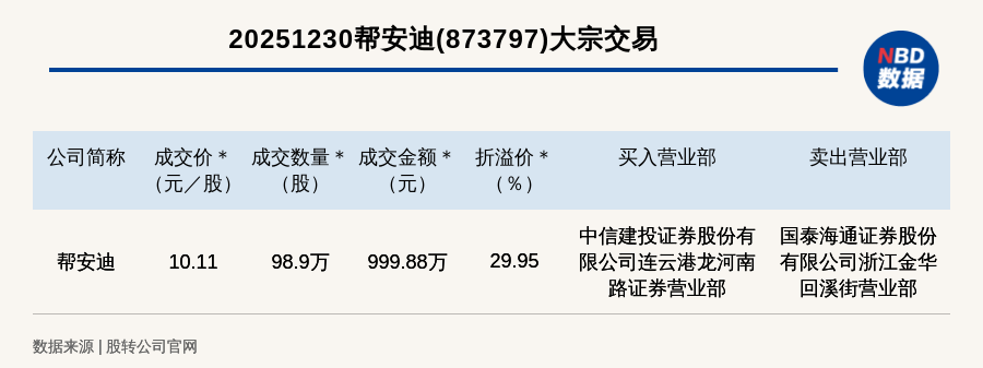 每經(jīng)訊,2025年12月30日,新三板創(chuàng)新層公司幫安迪(873797,收盤價:7.78元)發(fā)生一筆大宗交易,成交價10.11元/股,成交數(shù)量98.9萬股,成交金額999.88萬元,溢價29.95%。買入營業(yè)部是中信建投證券股份有限公司連云港龍河南路證券營業(yè)部,賣出營業(yè)部是國泰海通證券股份有限公司浙江金華回溪街營業(yè)部。
