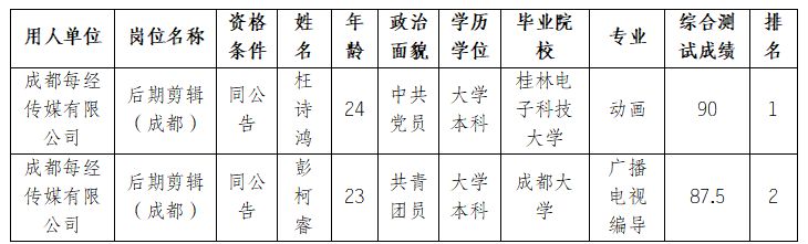 根據(jù)我司前期發(fā)布的招聘公告及招聘相關(guān)規(guī)定,經(jīng)資格審核、面試、復(fù)試、背景調(diào)查、體檢等程序,擬聘枉詩(shī)鴻、彭柯睿為后期剪輯(成都),現(xiàn)將名單予以公示。