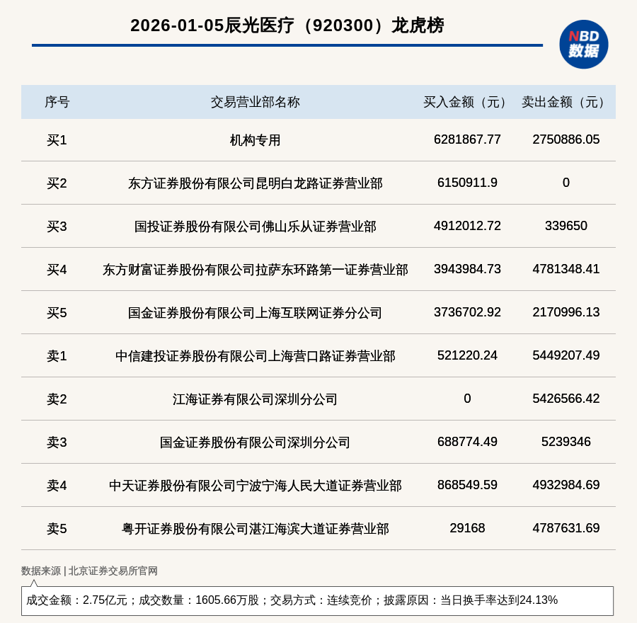 每經(jīng)訊,2026年1月5日,北交所上市公司辰光醫(yī)療(920300,收盤價(jià):17.3元)登上龍虎榜,交易方式是連續(xù)競價(jià),披露原因是當(dāng)日換手率達(dá)到24.13%,成交數(shù)量1605.66萬股,成交金額2.75億元。買一席位為機(jī)構(gòu)專用,買入628.19萬元;賣一席位為中信建投證券股份有限公司上海營口路證券營業(yè)部,賣出544.92萬元。