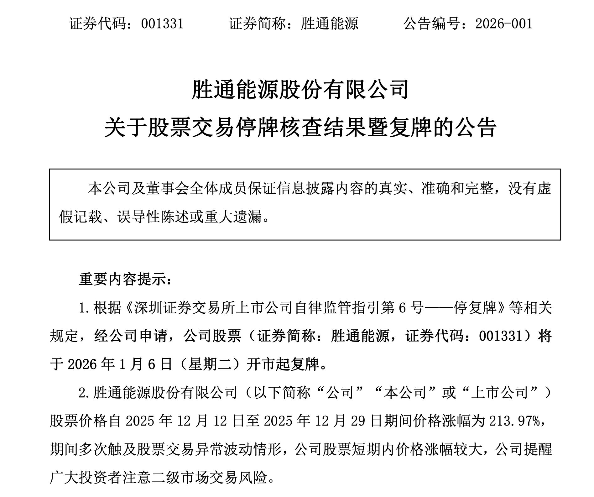 1月5日晚,勝通能源(001331.SZ)公告稱,停牌期間,公司就股票交易波動(dòng)情況進(jìn)行了核查。鑒于相關(guān)核查工作已完成,根據(jù)相關(guān)規(guī)定,經(jīng)公司申請(qǐng),公司股票將于2026年1月6日(星期二)開市起復(fù)牌。公司股票自2025年12月12日至12月29日期間價(jià)格漲幅為213.97%,公司股票短期內(nèi)價(jià)格漲幅較大。公司未發(fā)現(xiàn)近期公共傳媒報(bào)道了可能或已經(jīng)對(duì)公司股票交易價(jià)格產(chǎn)生較大影響的未公開重大信息。近期公司經(jīng)營(yíng)情況正常,不存在內(nèi)外部經(jīng)營(yíng)環(huán)境、相關(guān)業(yè)務(wù)發(fā)生重大變化的情形。