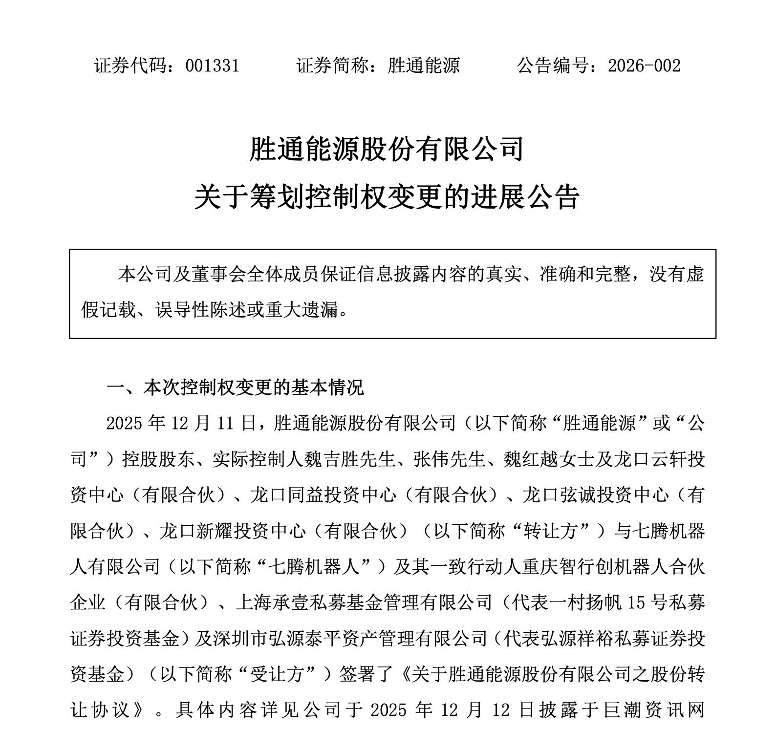 2025年12月11日,勝通能源披露重磅公告,重慶特種機(jī)器人企業(yè)七騰機(jī)器人有限公司(簡(jiǎn)稱“七騰機(jī)器人”)擬通過“協(xié)議受讓+部分要約收購(gòu)”方式,合計(jì)斥資超16億元持有勝通能源最多44.99%股份,成為控股股東。