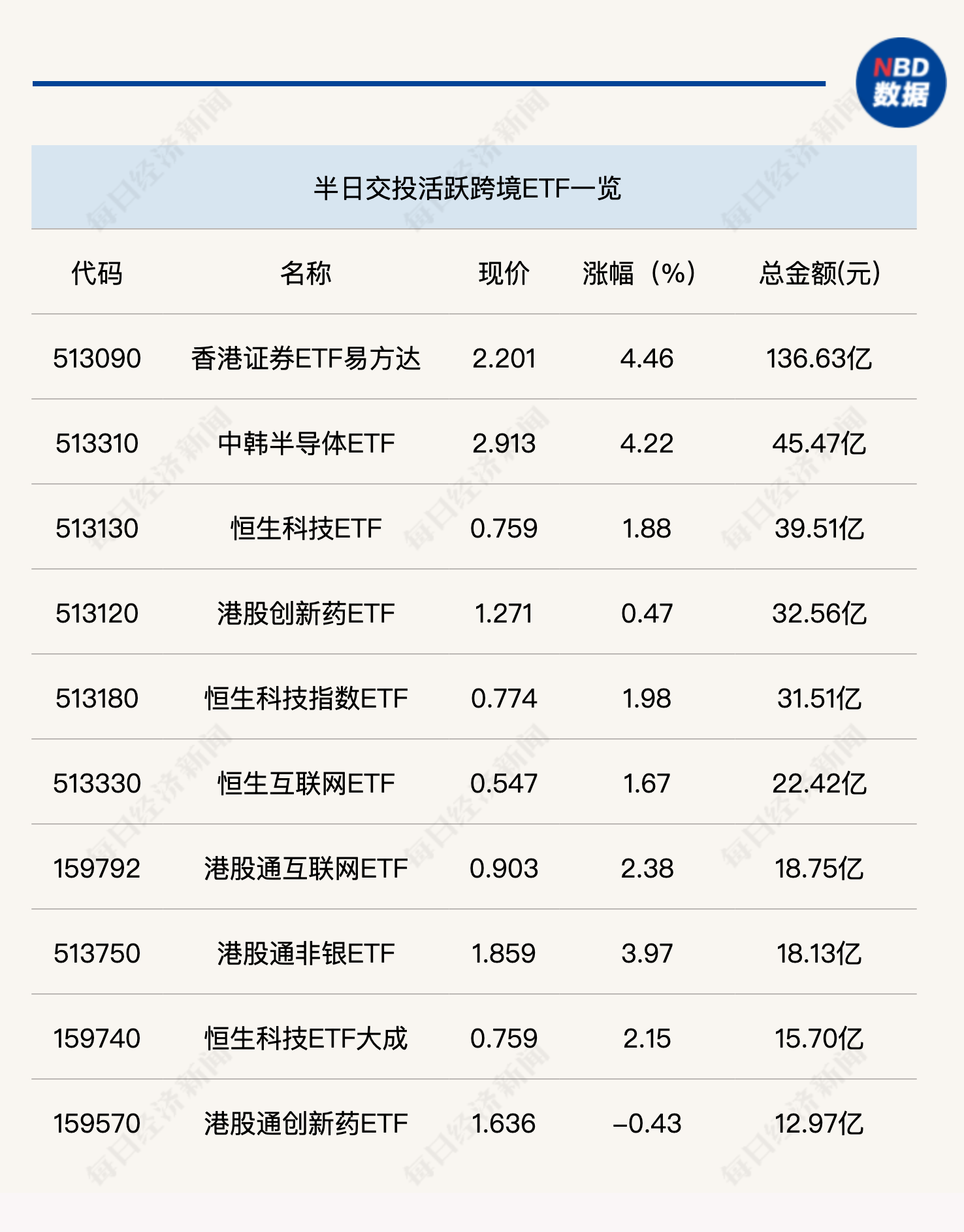 今日上午,ETF交易量繼續(xù)放大,證券ETF交投活躍。其中,證券ETF(512880)半日成交金額達到42.35億元;香港證券ETF易方達(513090)半日成交金額高達136.63億元。另外,科創(chuàng)芯片、券商、中韓半導(dǎo)體等ETF半日成交金額也在20億元以上。