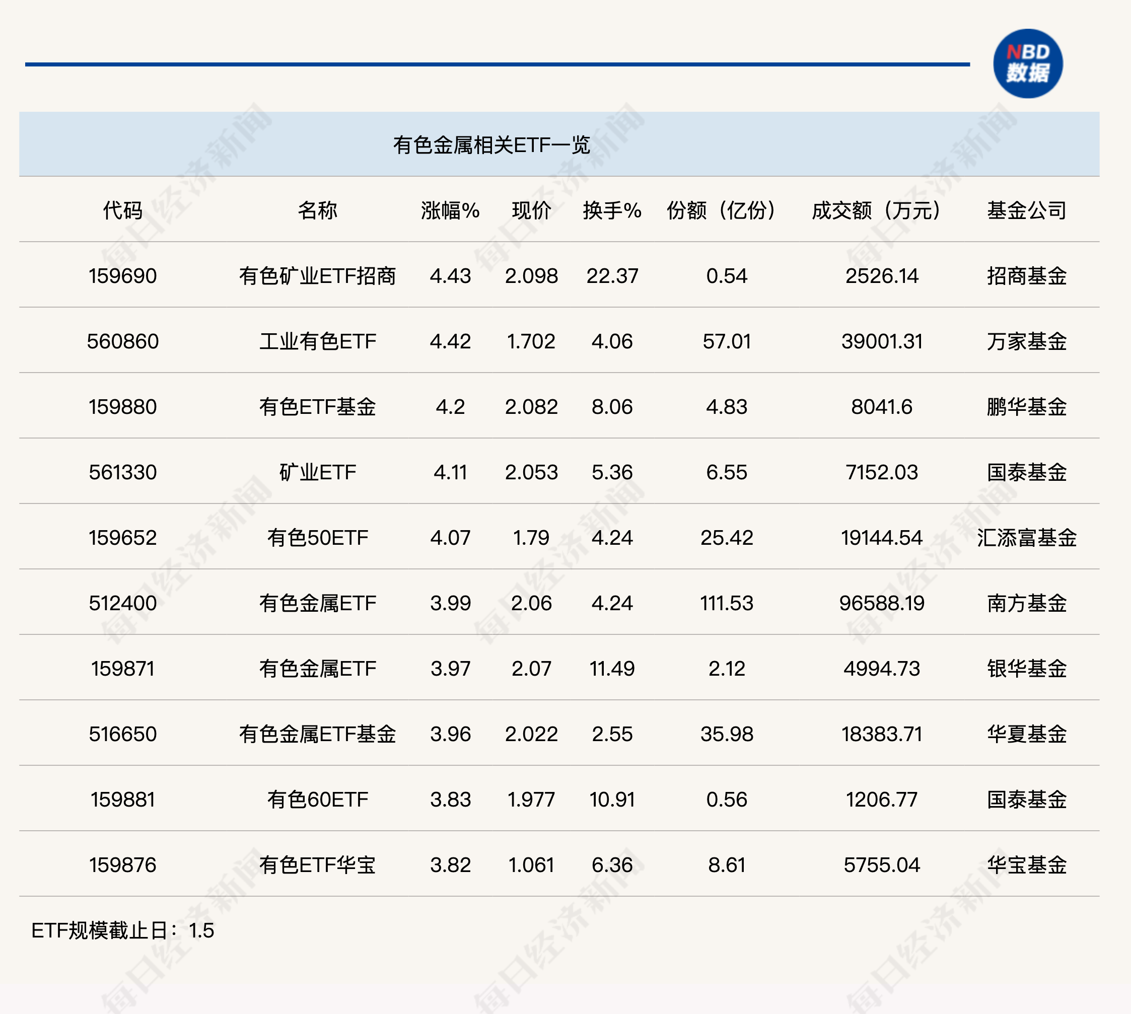 點評:有色金屬ETF(512400)半日漲幅3.99%。該ETF規(guī)模較大,達到111.53億份,是所有有色金屬ETF規(guī)模最大的品種,半日成交金額為9.66億元,追蹤的是中證申萬有色金屬指數(shù)。