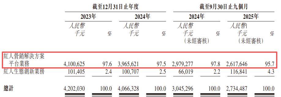 天下秀主營業(yè)務(wù)分為紅人營銷解決方案平臺(tái)業(yè)務(wù)以及紅人經(jīng)濟(jì)生態(tài)鏈創(chuàng)新業(yè)務(wù),其中,前者為公司的主要收入來源,通過公司主要的專有平臺(tái)WEIQ,為廣告主客戶提供紅人營銷解決方案。具體來看,2023年、2024年和2025年前三季度(下稱“報(bào)告期內(nèi)”),天下秀來自紅人營銷解決方案平臺(tái)業(yè)務(wù)的收入占比分別為97.6%、97.5%和95.7%。