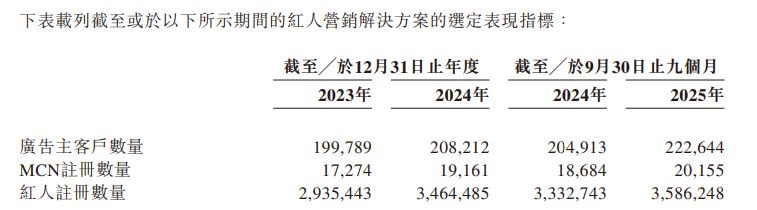 截至2025年三季度末,天下秀廣告主客戶數(shù)量約22.26萬,MCN和紅人注冊數(shù)量分別約2.02萬和358.62萬。