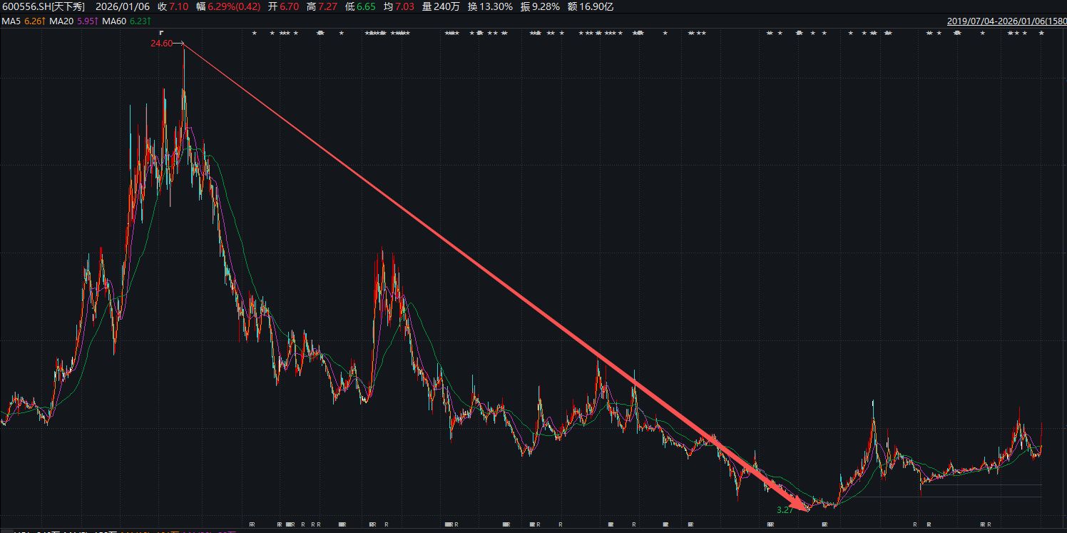 上市初期的2020年8月,天下秀盤中一度創(chuàng)下24.6元的高點(diǎn)。然而,隨后天下秀股價(jià)開啟了長達(dá)數(shù)年的震蕩下行,并在2024年7月創(chuàng)下3.27元的低點(diǎn),最大累計(jì)跌幅達(dá)86.54%。盡管2024年7月見底后天下秀A股股價(jià)有所反彈,但距離24.6元的高點(diǎn)仍相差甚遠(yuǎn)。