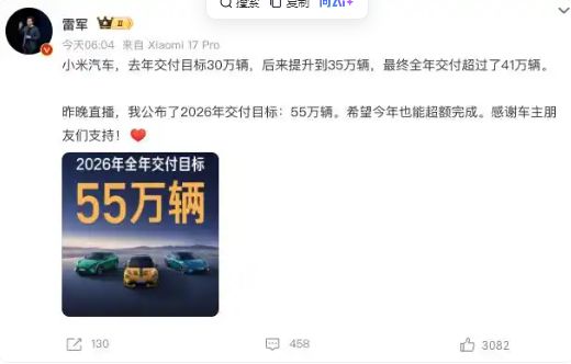 雷軍表示,2026年會將更多精力放在小米汽車上,對于2026年全年小米汽車的交付目標(biāo),雷軍解釋,2026年的目標(biāo)即不能太高也不能太低,既要有挑戰(zhàn)性同時也希望小米汽車全力以赴,最終確定2026年全年小米汽車的交付目標(biāo)為55萬輛,并希望今年也能超額完這個目標(biāo)。