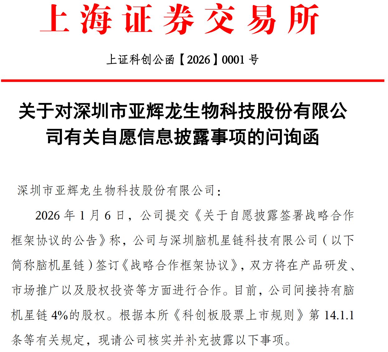 就在戰(zhàn)略合作公告披露當(dāng)日,上交所迅速向亞輝龍下發(fā)問詢函,圍繞合作可行性、研發(fā)細(xì)節(jié)、業(yè)績(jī)影響及內(nèi)幕交易自查等核心問題,要求亞輝龍披露回復(fù)。