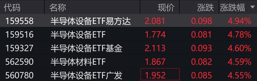 受盤面影響,半導體設備材料相關ETF漲超4%。