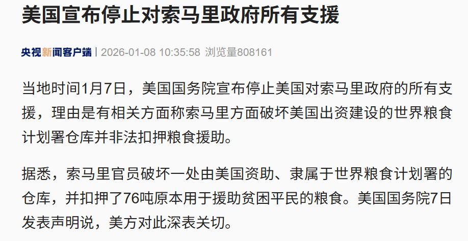 當?shù)貢r間1月7日,美國國務院宣布,因索馬里官員破壞美資助的世界糧食計劃署倉庫并扣押76噸援助糧食,美方將停止對索馬里政府的所有支援,并暫停所有現(xiàn)行援助項目,恢復與否取決于索方是否擔責并補救。美方正審查現(xiàn)有援助項目。近年來美國已大幅削減對外援助開支。