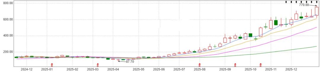 其股價(jià)從2025年4月25日開盤的105.37元/股一路震蕩上行,截至1月9日收盤,其報(bào)收752元/股,期間累計(jì)漲幅超過(guò)610%,并連續(xù)3日站穩(wěn)700元整數(shù)關(guān)口,在整個(gè)A股市場(chǎng)排名第三,位列科創(chuàng)板第二,僅次于寒武紀(jì)-U。