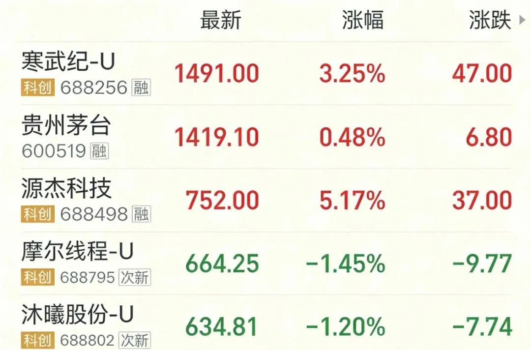 緊隨其后的,是近期國(guó)產(chǎn)GPU“明星股”摩爾線程-U(688795)和沐曦股份-U(688802),兩家公司均在2025年12月掛牌。A股股價(jià)TOP5公司中,除貴州茅臺(tái)外,其余四家均來(lái)自科創(chuàng)板,而源杰科技也是其中唯一一家盈利企業(yè)。
