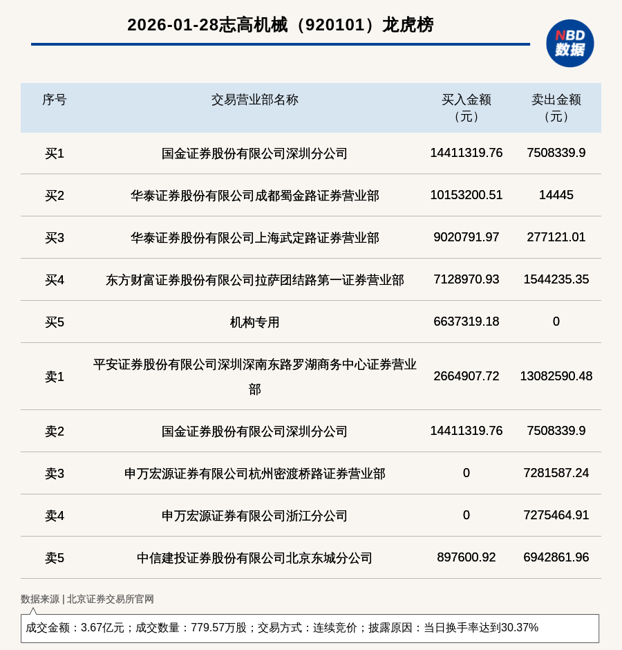 每經(jīng)訊,2026年1月28日,北交所上市公司志高機械(920101,收盤價:47.5元)登上龍虎榜,交易方式是連續(xù)競價,披露原因是當日換手率達到30.37%,成交數(shù)量779.57萬股,成交金額3.67億元。買一席位為國金證券股份有限公司深圳分公司,買入1441.13萬元;賣一席位為平安證券股份有限公司深圳深南東路羅湖商務(wù)中心證券營業(yè)部,賣出1308.26萬元。