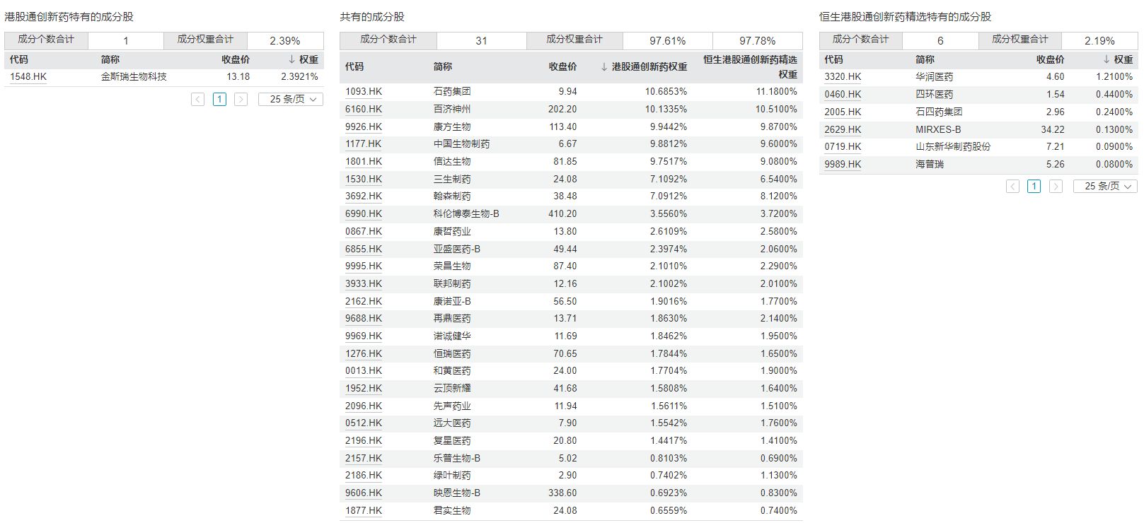 進(jìn)一步對比兩個(gè)指數(shù)的成分股,可以發(fā)現(xiàn)重合的成分股有31只,國證港股通創(chuàng)新藥指數(shù)獨(dú)有的成分股有1只——金斯瑞生物科技,恒生港股通創(chuàng)新藥精選指數(shù)獨(dú)有的成分股有6只,包括了華潤醫(yī)藥、四環(huán)醫(yī)藥等。
