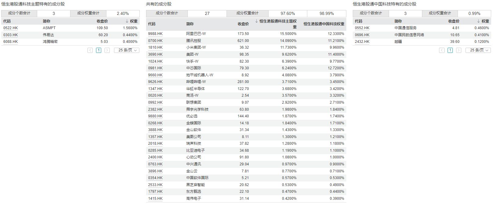 進(jìn)一步對比兩個(gè)指數(shù)的成分股,可以發(fā)現(xiàn)共同的成分股有27只,其中恒生港股通科技主題指數(shù)獨(dú)有的成分股有3只,分別為ASMPT、偉易達(dá)和鴻騰精密,恒生港股通中國科技指數(shù)獨(dú)有的成分股也是3只,分別為中國通信服務(wù)、中國民航信息網(wǎng)絡(luò)和越疆。