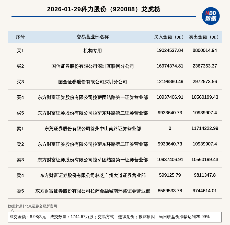 每經(jīng)訊,2026年1月29日,北交所上市公司科力股份(920088,收盤(pán)價(jià):60.51元)登上龍虎榜,交易方式是連續(xù)競(jìng)價(jià),披露原因是當(dāng)日收盤(pán)價(jià)漲幅達(dá)到29.99%,成交數(shù)量1744.67萬(wàn)股,成交金額8.98億元。買(mǎi)一席位為機(jī)構(gòu)專(zhuān)用,買(mǎi)入1902.45萬(wàn)元;賣(mài)一席位為東莞證券股份有限公司徐州中山南路證券營(yíng)業(yè)部,賣(mài)出1171.42萬(wàn)元。