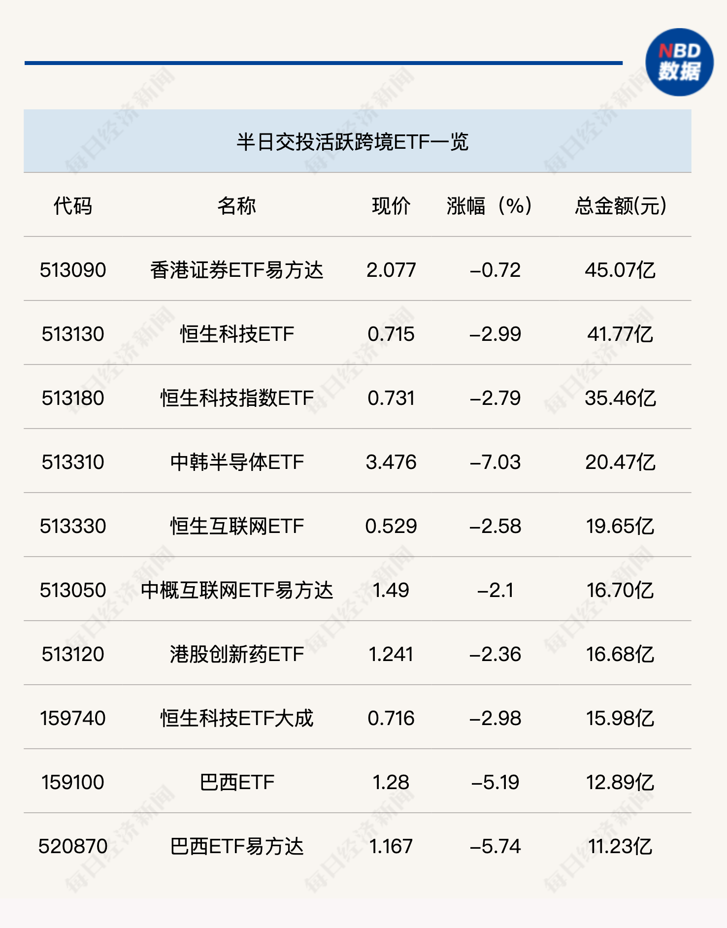 今日上午,有色金屬ETF(512400)和科創(chuàng)芯片ETF(588200)依舊保持高成交,兩只ETF半日成交金額均超過20億元;酒ETF(512690)也交易活躍,半日成交金額達到17.42億元。跨境ETF方面,香港證券ETF易方達(513090)和恒生科技ETF(513130)半日成交金額均超過40億元。