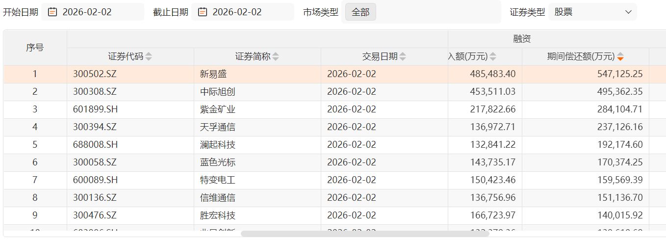 東方財(cái)富Choice金融終端數(shù)據(jù)顯示,2025年以來至2026年2月2日,中際旭創(chuàng)以4629.35億元融資總成交額排名兩融股票標(biāo)的第一,新易盛以4147.16億元排名第三。天孚通信以1558.45億元排名第十七。融資融券成交占比均超過總成交的10%。