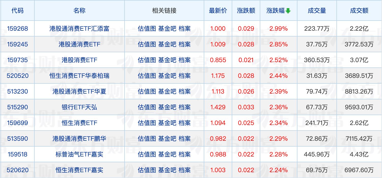 具體來看,港股消費(fèi)相關(guān)ETF集體走強(qiáng),最大漲幅為2.99%。